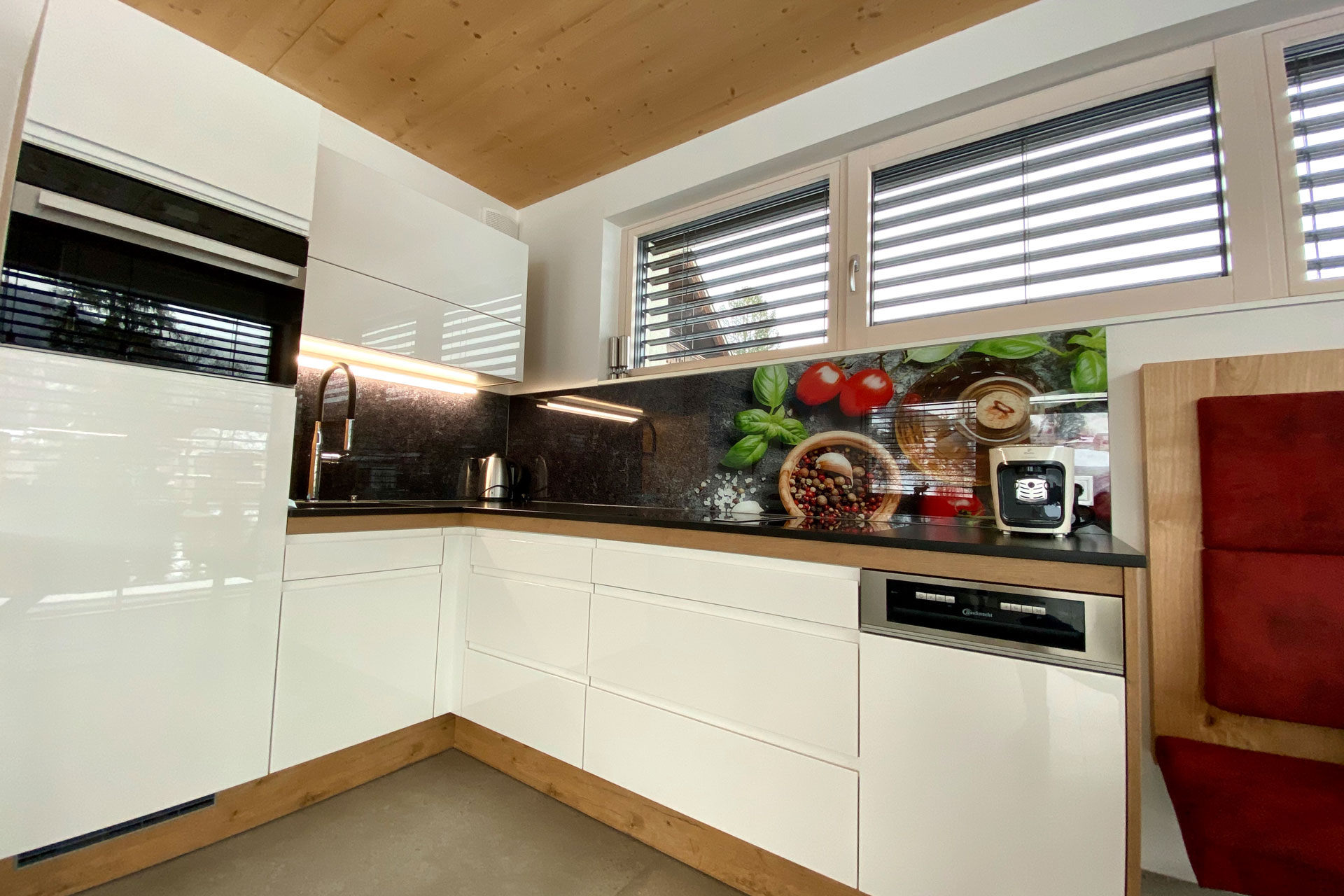fully equipped kitchen with induction hob, oven, dishwasher, fridge with freezer, kettle,Toaster, coffee machine - Bathroom with rain shower and double sink